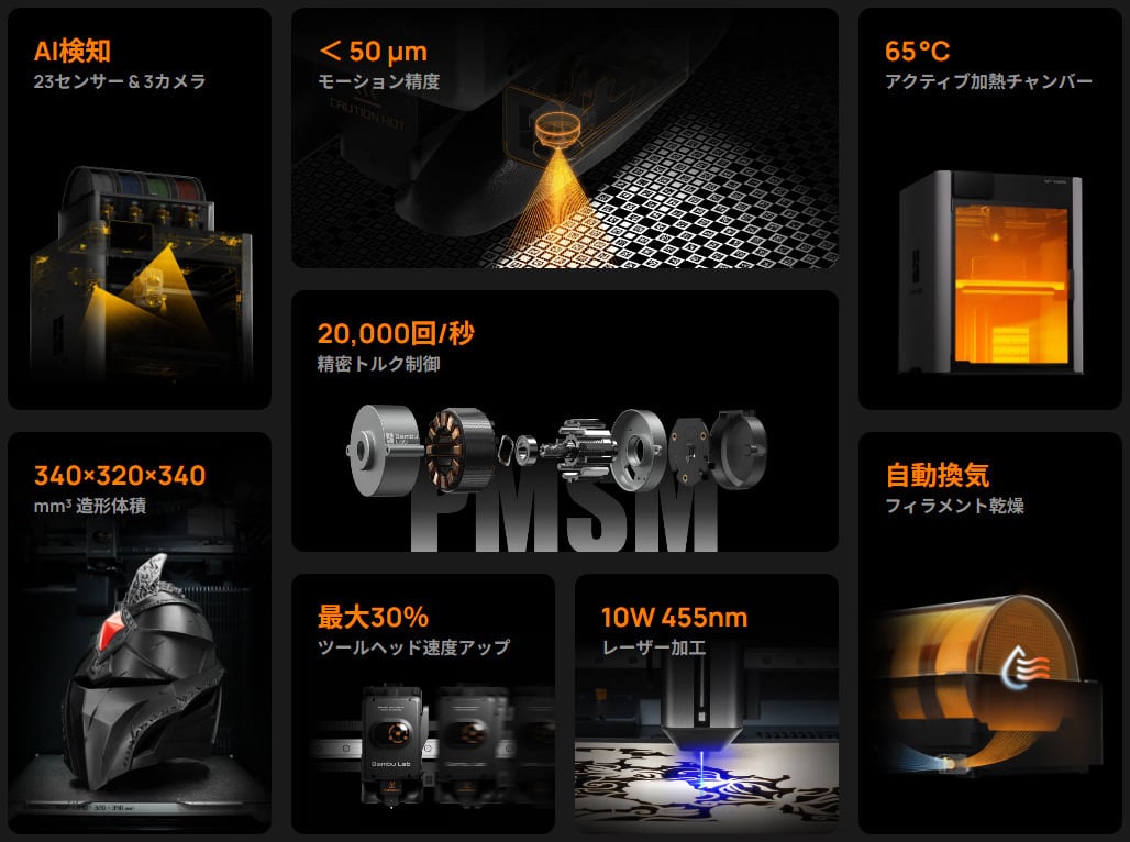 ■ 多色・乾燥一体化:AMS 2 Pro/AMS HT(別売)により多色造形やフィラメント乾燥機能を利用できます。